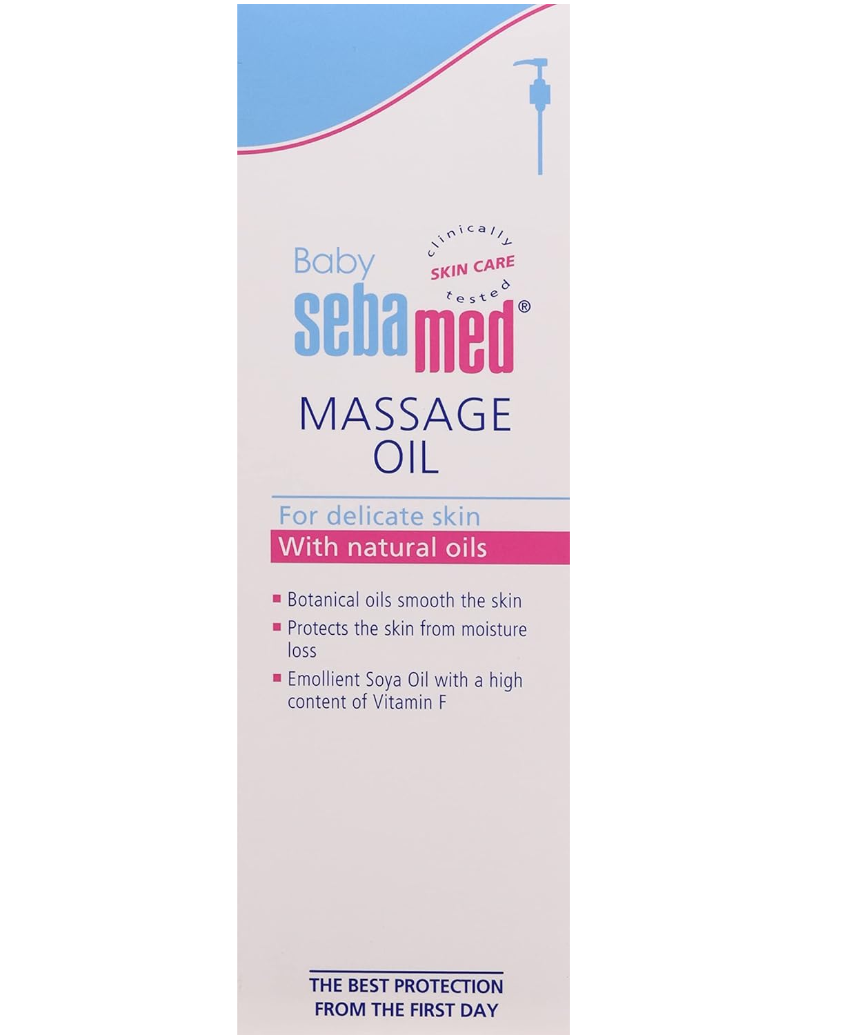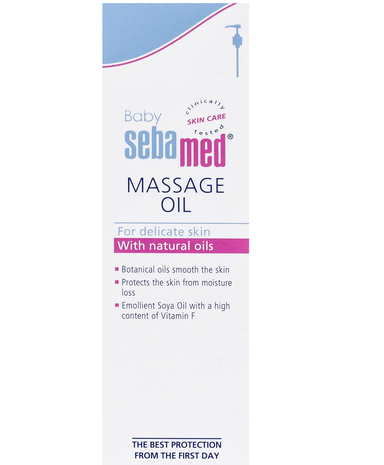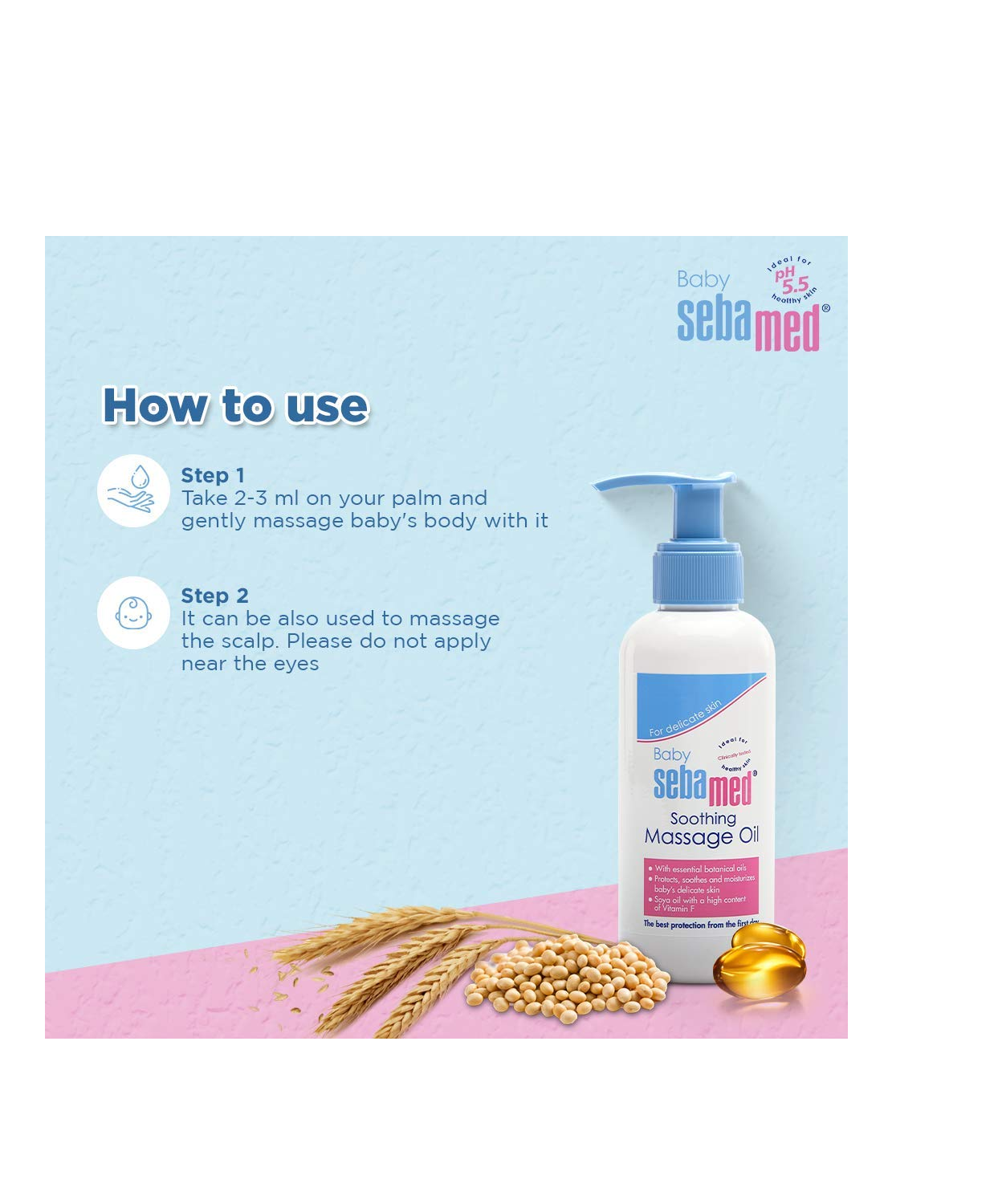 • Take 2 to 3 ml of Sebamed soothing massage oil on your palm with the help of unique pump applicator and gently massage baby’s body with it